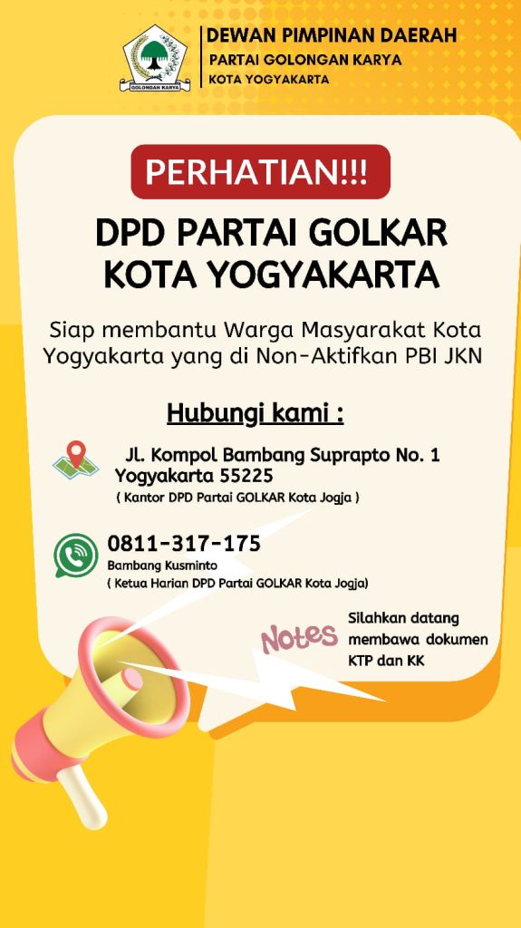 “Kami di DPD Golkar Kota Jogja siap membantu teman-teman, keluarga, dan masyarakat yang BPJS-nya dinonaktifkan dengan menghubungi hotline kami +62 811-317-175 atau datang langsung ke DPD Partai Golkar Kota Jogja yang berlokasi di Jalan Kompol Bambang Suprapto No. 1, Kelurahan Baciro, Kemantren Gondokusuman, Kota Jogja dengan membawa identitas foto kopi KK dan KTP khususnya yang membutuhkan layanan rutin. Jangan sampai masyarakat kecil menjadi korban kebijakan administrasi,” tegasnya.